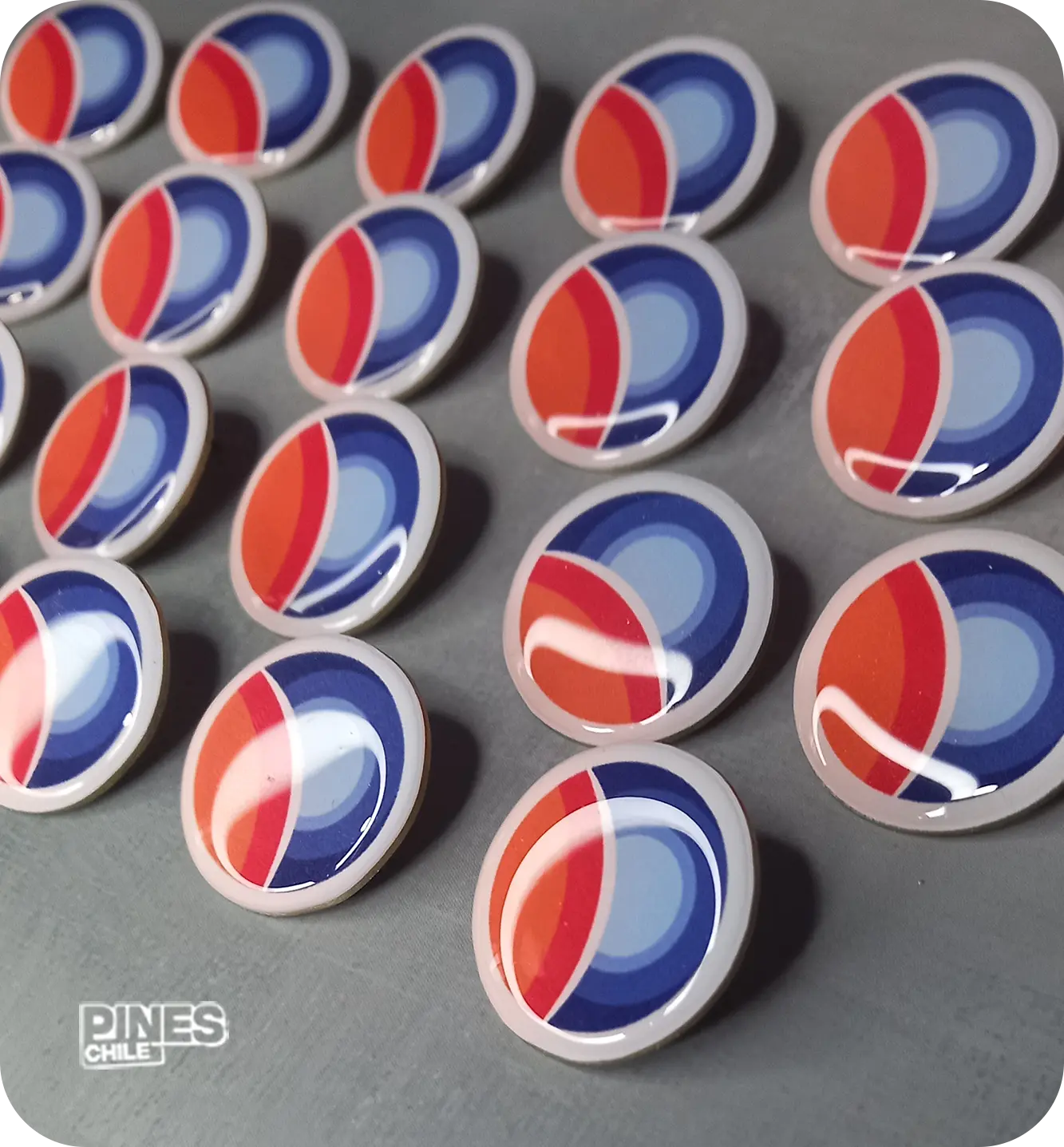 El acabado con resina les da un efecto tridimensional brillante que los hace lucir premium. A diferencia de pines pintados o esmaltados, no hay límite en la cantidad de colores que puedes usar. Puedes incluir rostros, paisajes, ilustraciones artísticas y efectos especiales. Son ideales para piochas corporativas que requieren diseños sofisticados o para eventos especiales con fotografías personalizadas.